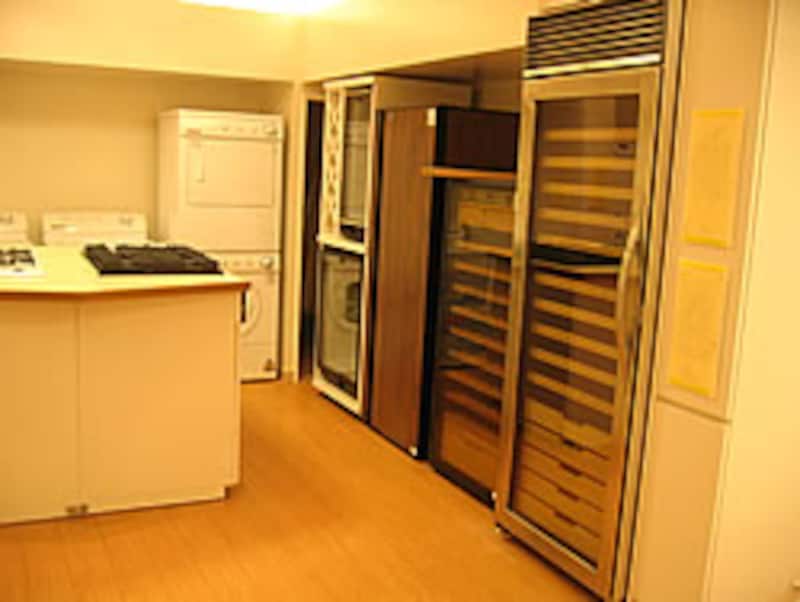 日本でも最近人気の高まってきたワインセラーは、奥からワインクーラーとして使いやすいコンパクトなU-LINE社2機種、ウッドドアとガラスドアの熟成ワインセラーとしても利用できるフランスTRANSTHERM社、庫内を3ゾーンに分けて温度管理できるVIKING社の5機種が展示されている。 |