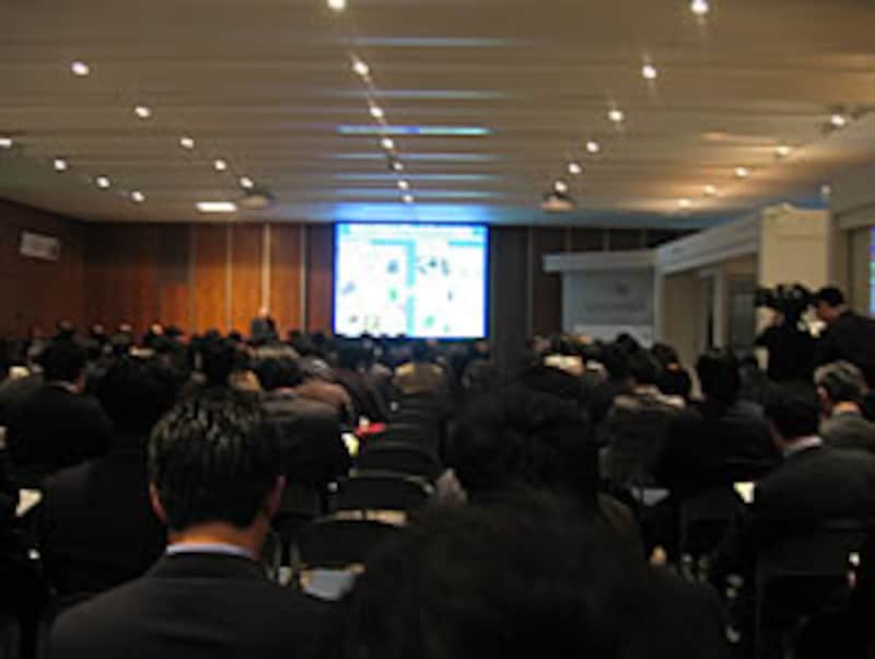 200名近い報道関係者を前に、松下電器の戸田副社長、松下電工の菊地副社長からコラボV戦略の説明と、家庭の住空間を快適に創造するバス、トイレ、キッチン、リビングの新商品アイテムが紹介された。 |