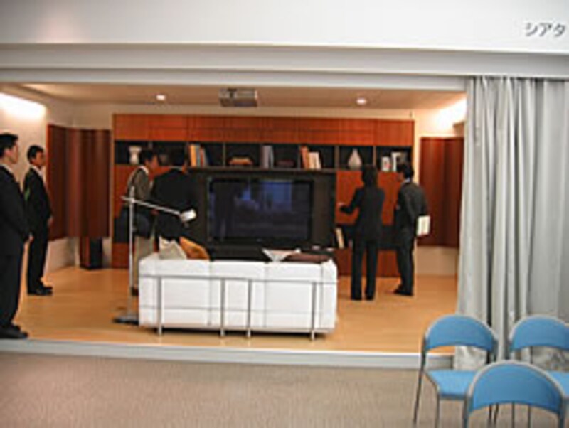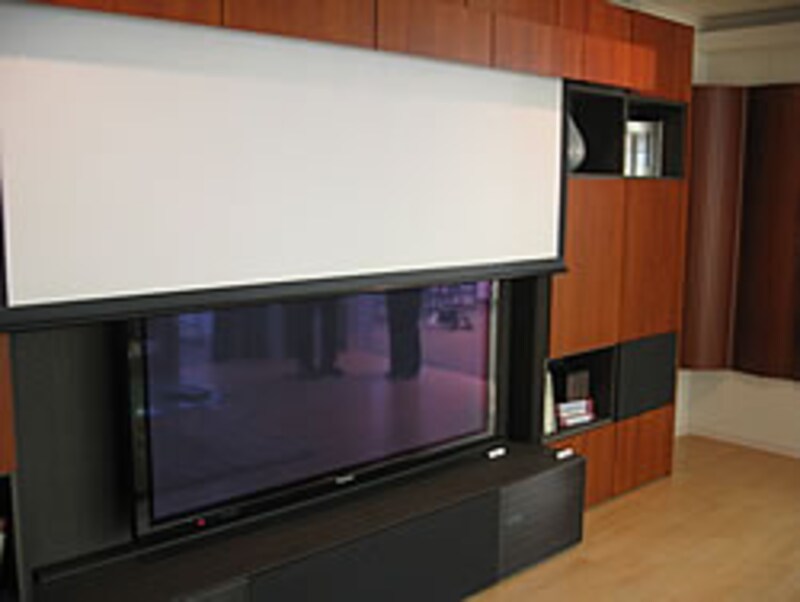 ●システムファニチャー「CUBIOS」65インチプラズマTV(別売)、5.1チャンネルサラウンドシステム(別売)、80インチロールスクリーン組込。奥行き寸法350mm、間口寸法モデュール550mmでローボードタイプも構成可能。 ※発売開始2005年2月1日 ※希望小売価格(税込工事費別)3300mm巾 1,575,000円 |