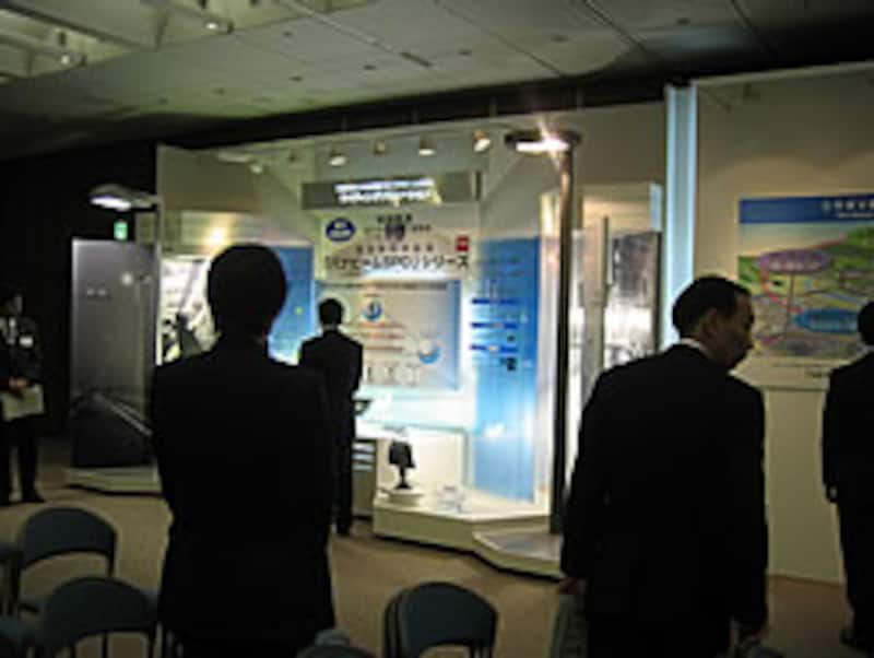 200名近い報道関係者を前に、松下電器の戸田副社長、松下電工の菊地副社長からコラボV戦略の説明と、家庭の住空間を快適に創造するバス、トイレ、キッチン、リビングの新商品アイテムが紹介された。