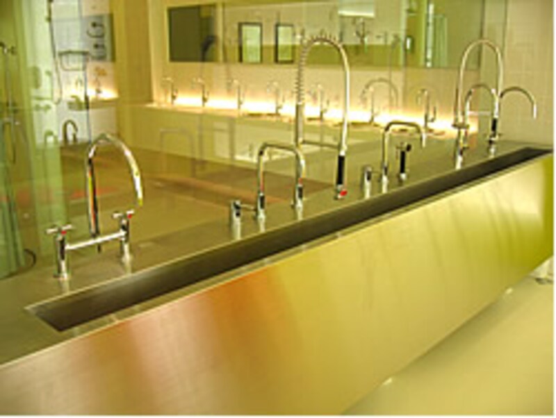 | le bainショールームは、前ページでも書きましたが、サニタリー空間主体の構成となっています。キッチン空間も同じ水廻り空間ですし、キッチンデザインのヒントとなるアイテムがここにはいろいろ詰まっています。 新築やリフォームの計画段階には、ぜひともこのショールームに足をお運びください。 |