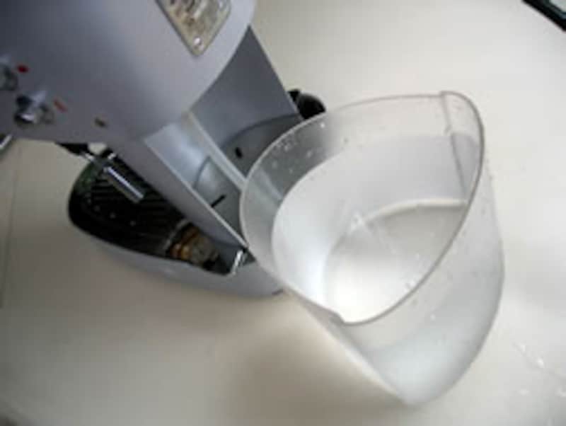 梱包をあけて、一通りの部品を確認した後、まず中性洗剤でよく洗ってから使いはじめることは、キッチングッズに共通した使い始めの儀式。約800ml入る背面の水タンクに水を入れ一度煮沸させて、すべての熱湯を抜きタンク内も掃除する。