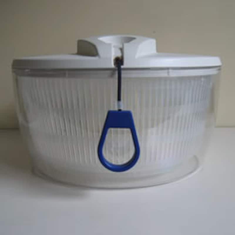 | 青い握りのついた紐を引っ張るだけで、中のバスケットが回転し洗った野菜の水気を切ってくれます。 | |