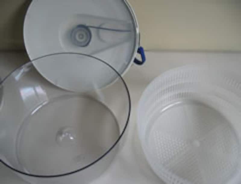 | ポリプロピレン樹脂製ボウルと水切りバスケット、ABS樹脂製の盖の三つの部品で構成されています。 | |