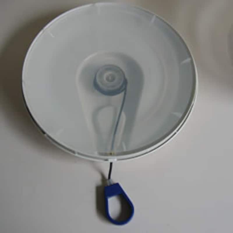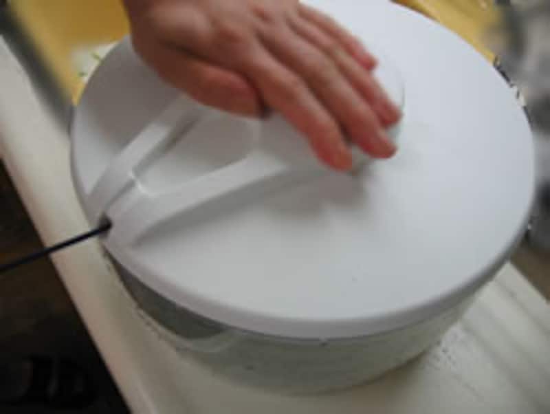 | 蓋をきっちり締めて押さえながら、紐を引っ張ります。自動的に紐は巻戻り、今度引くと逆回転をします。紐を引っ張るたびに逆回転しますから三度くらい引っ張れば充分に水気は切れます。 | |