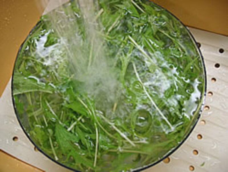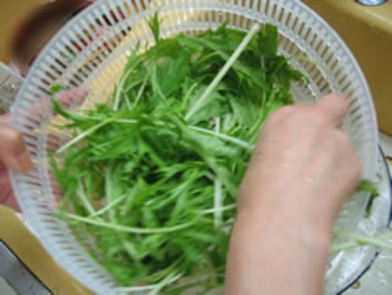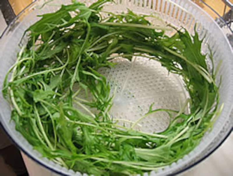 | 三度引っ張ったあとの、水菜の状態です。十分に水気が切れたサラダの美味しさを堪能してください。 | |