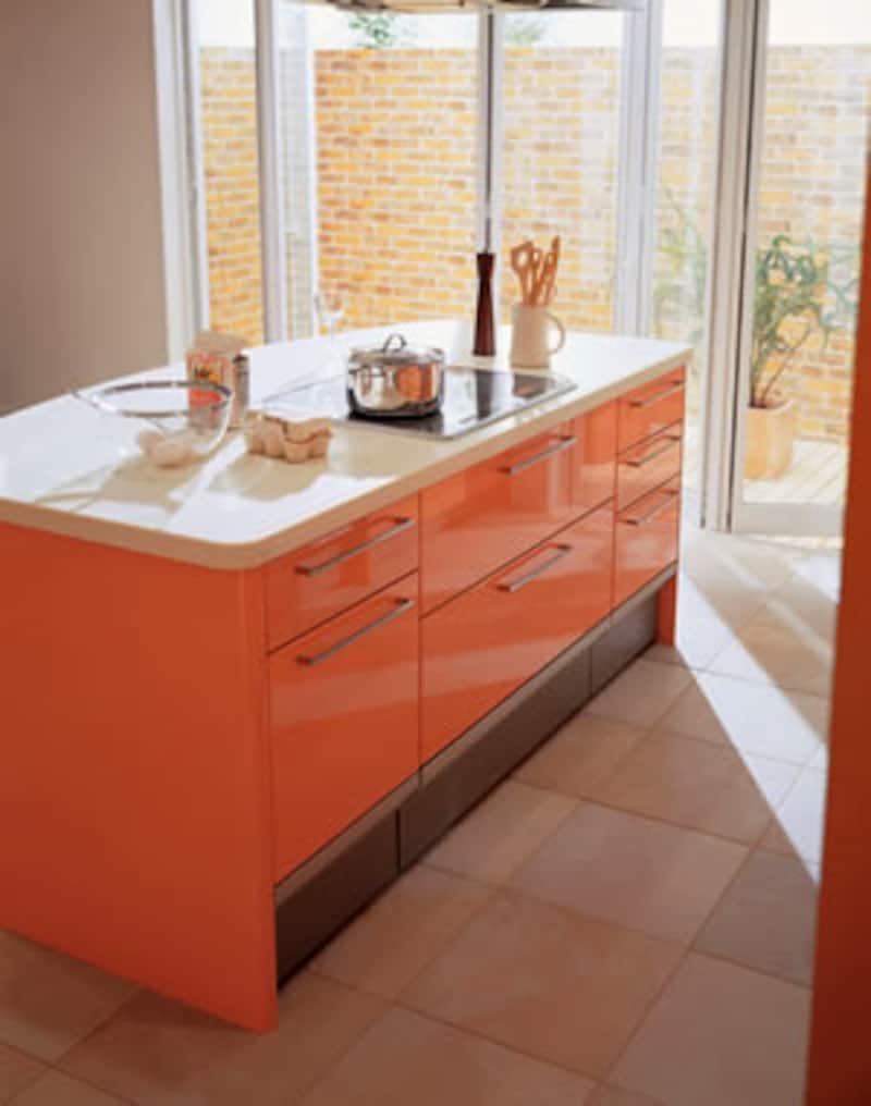| 「スクエアタイプ」と名づけたアイランドキッチンは、シンクとクックトップの両方を角形のアイランドカウンターで構成したタイプ。間口2530mm×奥行1105mmの基本タイプは約114万円(アイランド部分)。 |