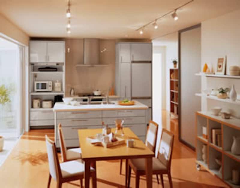 | クックトップは壁面に、アイランド部分にはシンクを配したアイランドキッチン。壁面のレンジフードは油煙の捕集が楽なので、ダイニング側に臭いや煙りがまわりにくいメリットがあります。間口1930mm×奥行1105mmの基本タイプは約73万円(アイランド部分)。 |