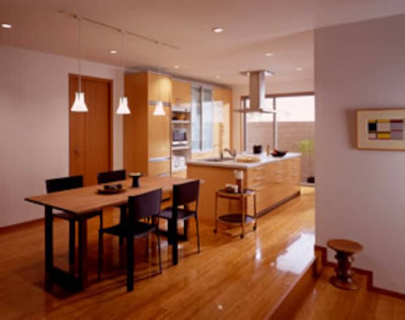 | 調理した暖かい料理をそのまま連続してテーブルで楽しめるのが、アイランド部分にクックトップを組込んだ「コンロタイプ」。次のページで紹介するセンターフードと合わせて利用して下さい。間口1930mm×奥行1000mmのテーブルプラン基本タイプは約114万円(アイランド部分)。 |