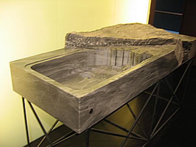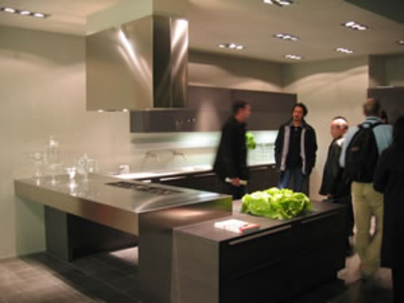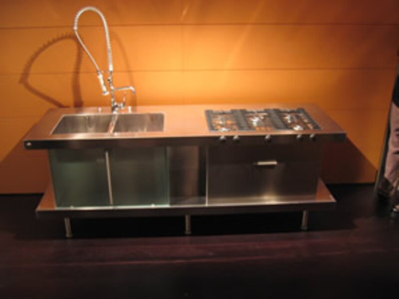 | ハイセンスなキッチンデザインで知られるこのメーカーのコンセプトモデルは、無垢石を削り出したシンクとオールステンレスのコアユニットキッチン。 |
