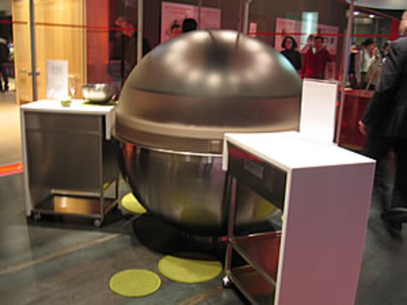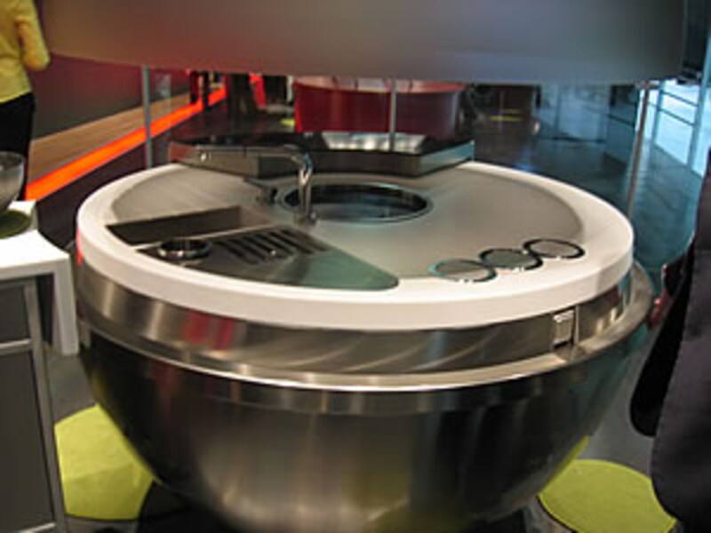 | トラディショナルデザインのキッチンを得意とするメーカーから実験的なキッチンが提案されている。 丸いカプセル型のキッチンは上半分のキャップが電動で開閉する。 |
