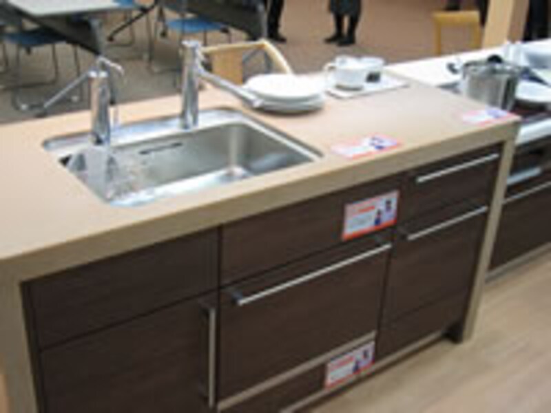 | LANDプランと名付けられたアイランド型のオープンキッチン。シンクは排水目皿からトラップまでオールステンレスに変更され、手入れのしやすさを強調。 | ||
