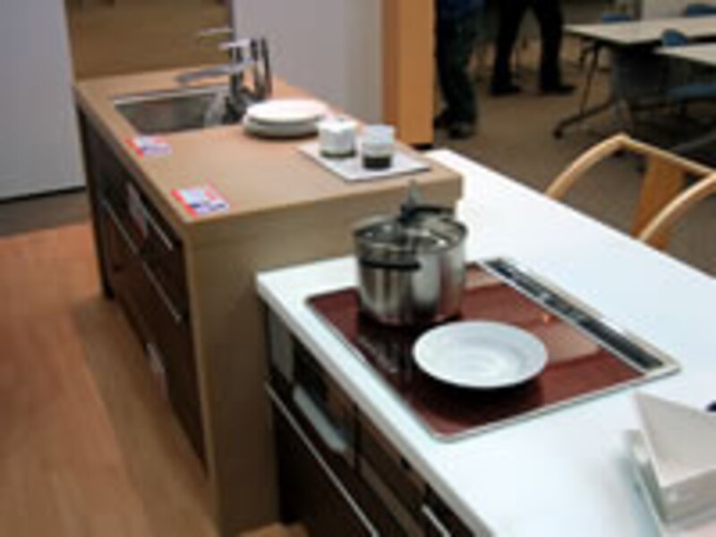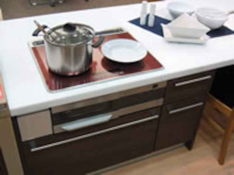 | テーブルカウンターに連続するクックトップカウンターにはIHクッキングヒーターがビルトインされ、カウンターの高さは720mm。 | ||