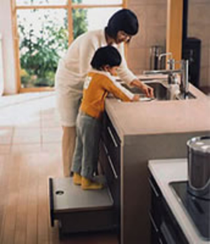 1:高品質(静かさ、使いやすさ、手入れ性)を徹底的に追求。 ★静かさ: 引き出しや扉に静音ダンパーを設け、閉る時の音を軽減。 またシンクも裏面に防音ゴムを装着し水の当たる音も軽減した。 ★使いやすさ: お子様からお年寄まで末永く使ってもらうために、ユニバーサルデザインの発想を徹底した。引き出しは重いものを収納してもスムーズに奥まで引き出せ、内部には収納物をスッキリ効率よく収納できる仕切りパネルを装備。また高い所の収納もスイッチ一つで目の高さまで降りてくる電動昇降収納やキッチンで座って作業の出来るワゴンなど、多彩なアイテムを自由に組み合わせて使いやすいプランができる。 ★お手入れ性: 引き出し・シンク下ユニットの底板には耐久性、手入れ性のよいステンレスを採用。さらにヌメリの付きやすい排水にもステンレスを採用しており手入れが簡単に。 |