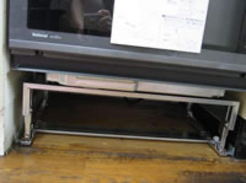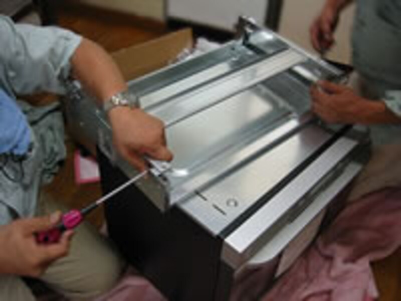 | まず、オーブンレンジを取付けるため巾木部分の金属フレームを組み立てる。この時巾木高さの必要寸法を割り出して調整を行なう。 | ||