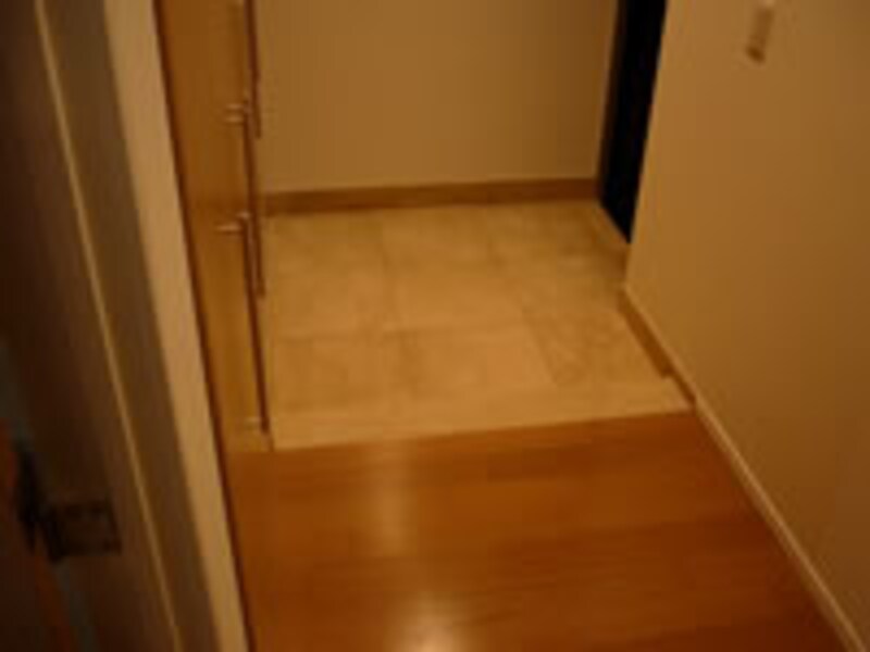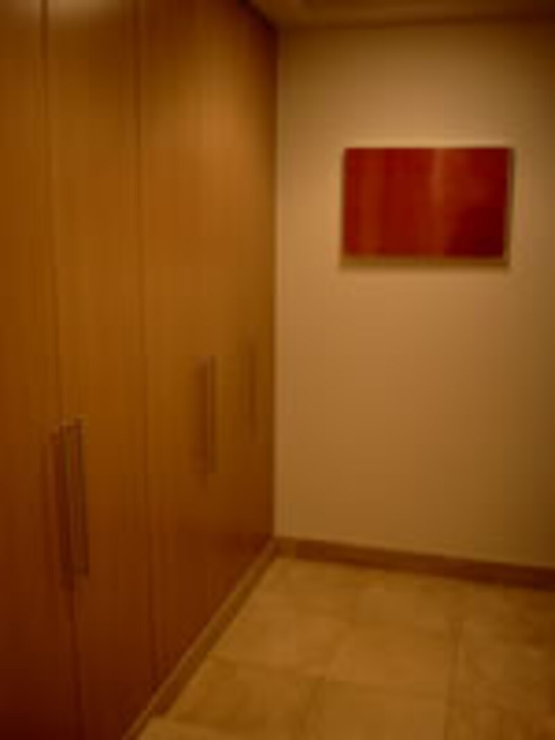 | 共用廊下のアルコーブにはトランクルームが設置され、玄関に入ると大型のイタリア製収納システムが壁面一杯に取り付けられている。 | 大判天然石の床と上り框に30mmの段差がある以外、室内はフルフラットの床となっており、ユニバーサルデザインの思想が生かされている。 | |