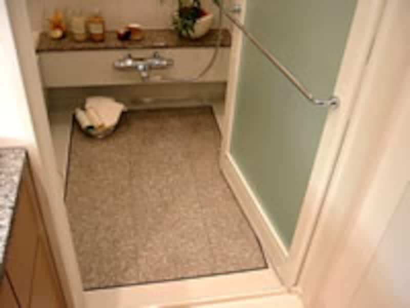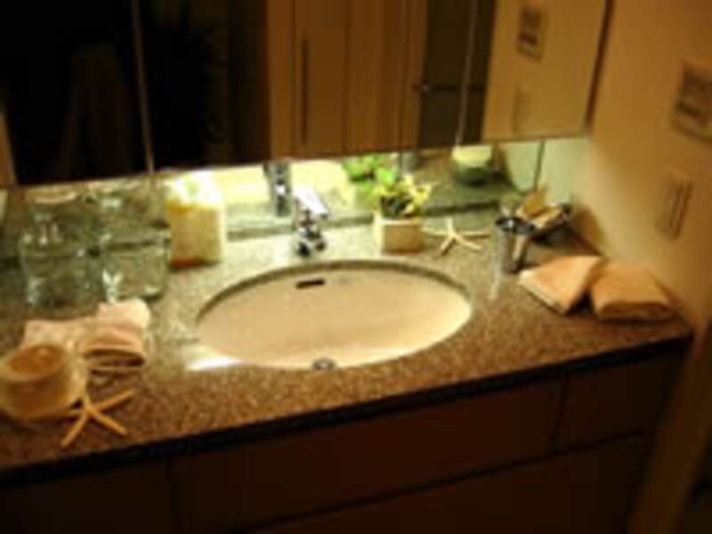 | 化粧室から浴室への床も、フルフラットの納まり。 | 洗面化粧台のカウンターも、格調ある天然大理石。 | |