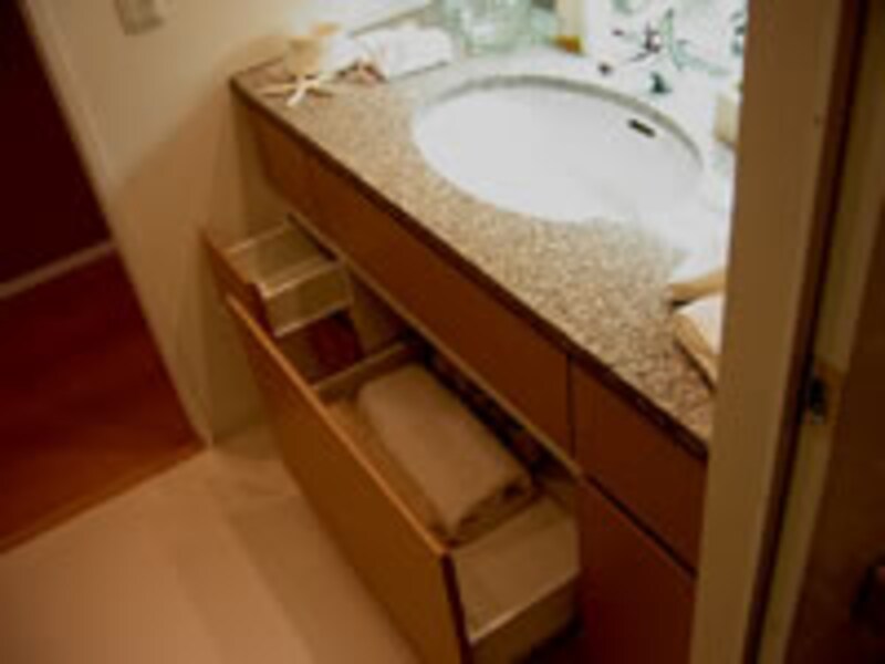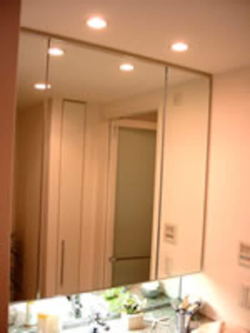 | 洗面化粧台の収納付き大型三面鏡。 | 化粧台のベースユニットは引き出し収納式。 | |