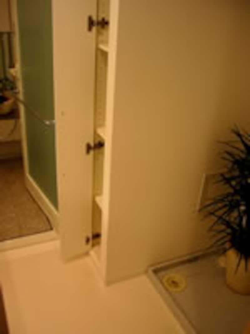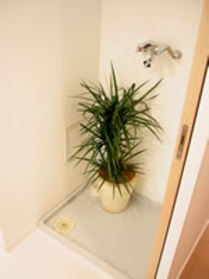 | 洗濯機置き場の防水パン。右写真のように少しでもスペースがあれば収納庫として活用。こんなちょっとした心遣いが嬉しい設計である。 | ||