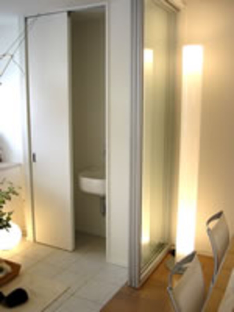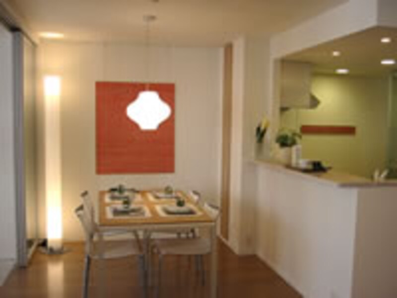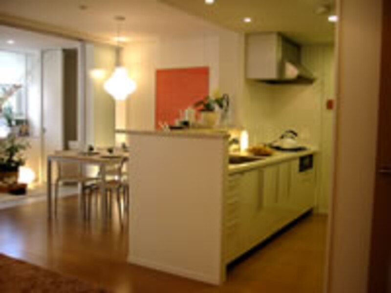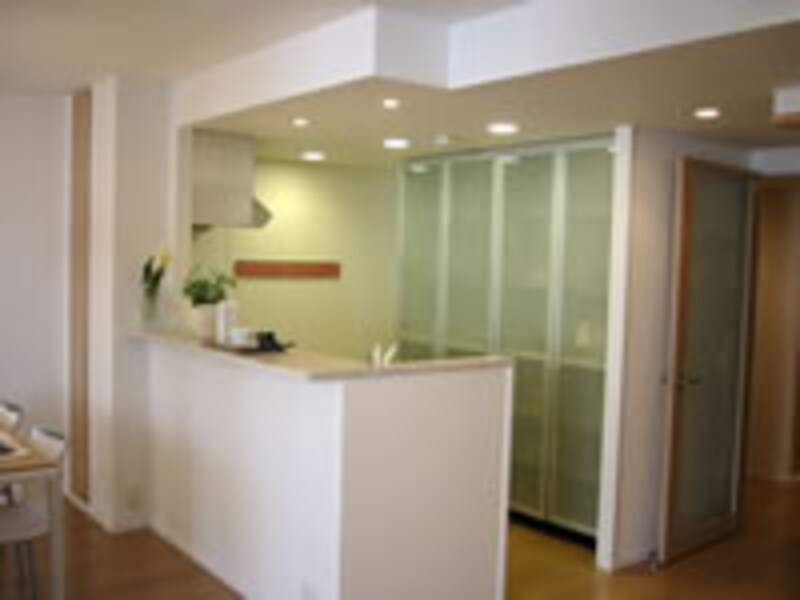 | リビングダイニングからキッチンを見る。オープンキッチンには半透明大型扉の食器棚が見えるだけで、非常にすっきりと納まり快適空間を提供している。 | ||