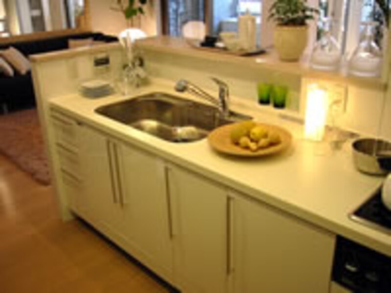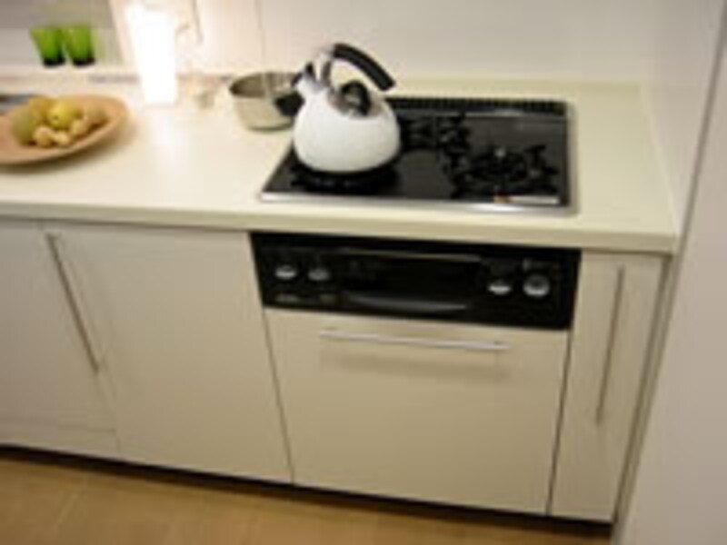 | 中に回り込むとハイカウンターで囲まれたキッチンがある。ガラストップの三口グリル付きクックトップが標準装備。 | ||