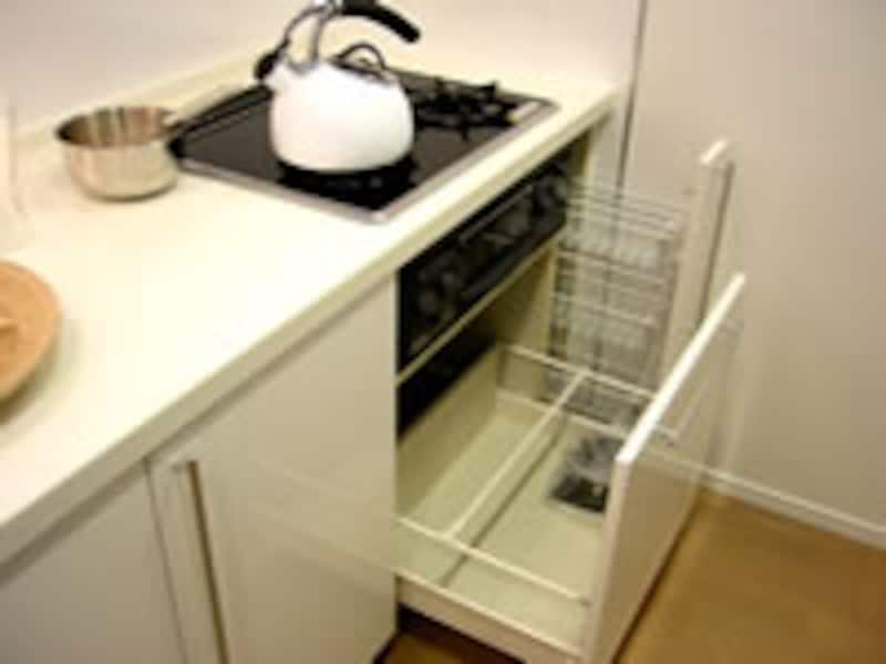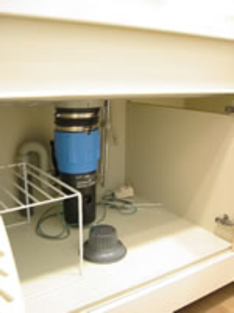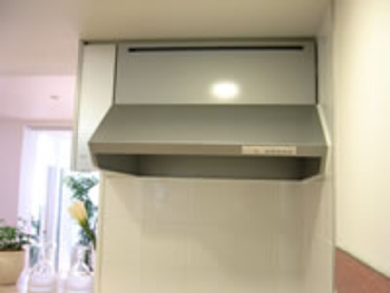 | スッキリしたデザインのレンジフード。シンクの排水口には生ごみ処理システムを採用したディスポーザーが標準装備されている。 | ||