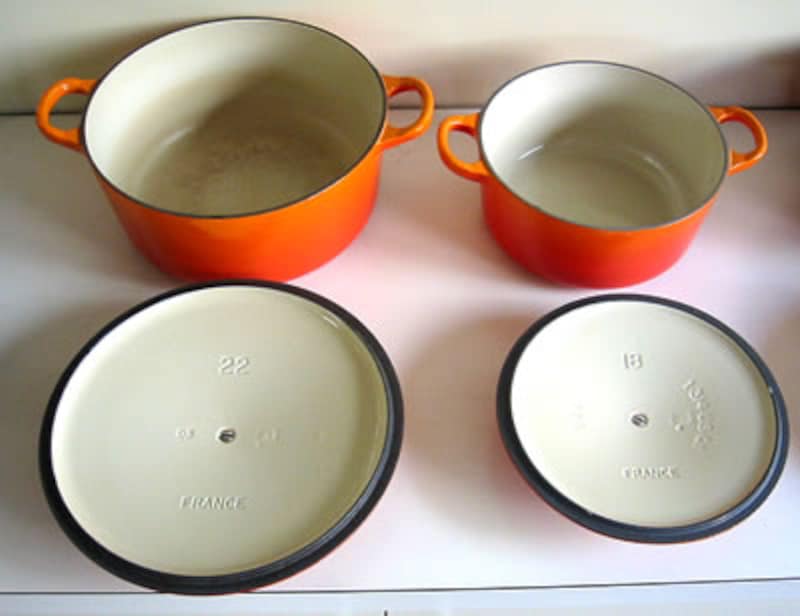 | 我が家のルクルーゼは#22と#18のココットロンドと呼ばれる一番使いやすい形とサイズのもの。左の#22は使い始めてもう2年以上経過したもの、右の#18は昨年購入してまだ1年も経っていない。 豆類、魚介類、肉類等アクの出やすい食材を煮込み料理に使うことが多く、どうしても最初の頃の光沢のあるクリーミーホワイト色にはシミが残ってくるが、これも使い込んだ味わいと納得するべき道具なのかも。どうしても気になる場合は、シミがついたなと思ったらすぐにクリーム洗剤とスポンジでていねいにこすれば、あらかたは取ることができる。お酢で取れるという話もあるが、実際はほとんど無理。 左は#22サイズ、容量は3.4リットル、実寸227mmφ、ハンドルを含む幅寸法295mm、鍋本体の高さ100mm、鋳物ホーローの肉厚約4mm、鍋本体重量2.6Kg・蓋を含んだ合計重量3.8Kg。 右は#18サイズ、容量は1.9リットル、実寸188mmφ、ハンドルを含む幅寸法248mm、鍋本体の高さ88mm、鋳物ホーローの肉厚約4mm、鍋本体重量1.8Kg・蓋を含んだ合計重量2.6Kg。 |