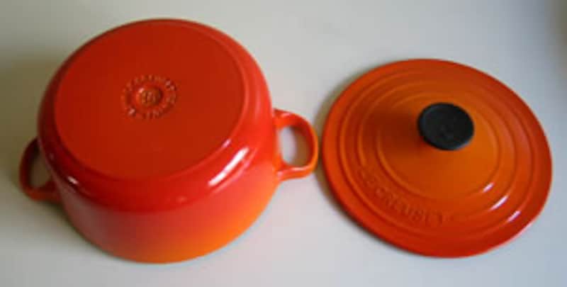 | ルクルーゼの鋳物琺瑯鍋が愛される大きな理由の一つがその色使いの美しさと言える。 微妙なグラディエーションで変化する色は、キッチングッズというよりもインテリアグッズとしての存在感すらある。蓋のつまみは、耐熱プラスティックで取説には230度までのオーブンに使えるとあるが、そのままオーブンで使うのは遠慮しておいた方が良いと思う。 |