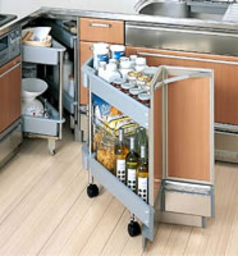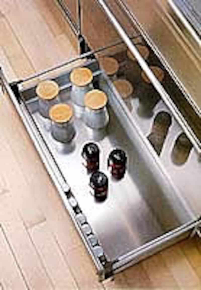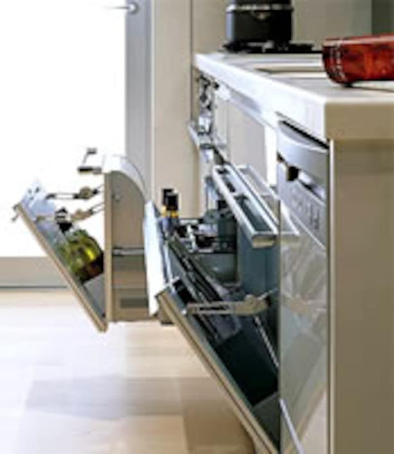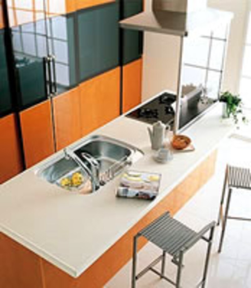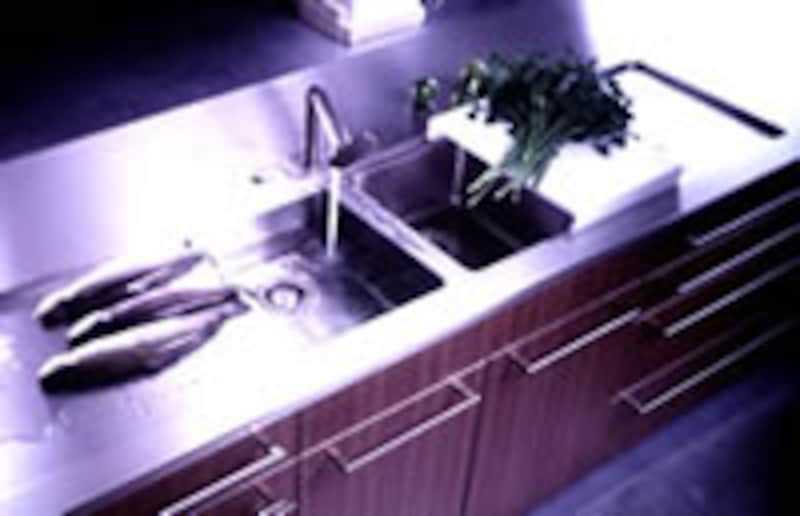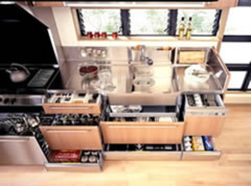 | 今年のキッチン業界で話題をさらった商品のひとつがコレ!!オールステンレスのキャビネットはエコロジーとリサイクルの観点からも評価が高い。コンセプトとなった「ミニマルデザイン」と「マテリアルミックス」の思想をこの商品に思いっきり反映させている。お馴染みとなったフロアコンテナ収納もますます充実してきた。 | ||