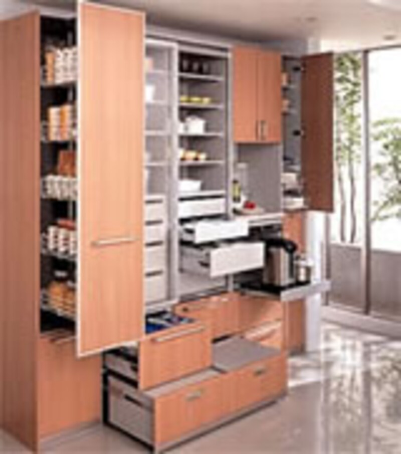 | もう一社話題の製品が新登場した。昨年サンヴァリエピットに登場したドアポケットと呼ぶ新しい画期的な収納システムは、今回ラヴィータ・センテナリオでより高密度収納としての完成度を高めた。 無駄なスペースを省いて収納効率を高めるには、このような技術背景が必要であり、商品化へ結び付けた技術力を高く評価した。 |