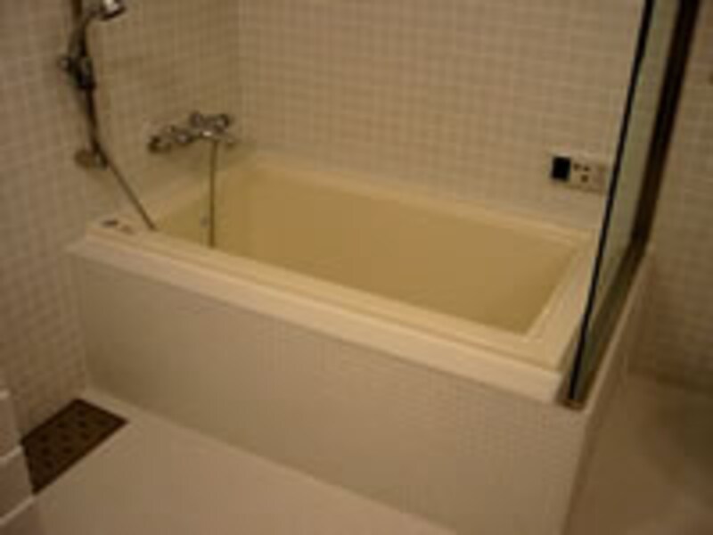 | バスルームは、洗面・トイレ一体の三位一体型だが、ユニット工法でなく現場施工のタイル仕上げ。 バスタブの仕切りもガラスパーティションで区切られているため図面で見るよりも、ぐんと広く感じる。 |