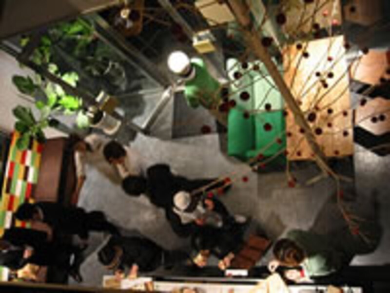 | 「O.R.G food bar」2階の吹抜けから1階を見る。シンボルの小さな林檎マッキントッシュがツリーになって飾られている。林檎の場合はMcintoshと綴るが、AppleのパソコンはMacintoshとaが入る。 | ||