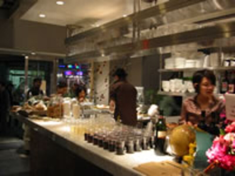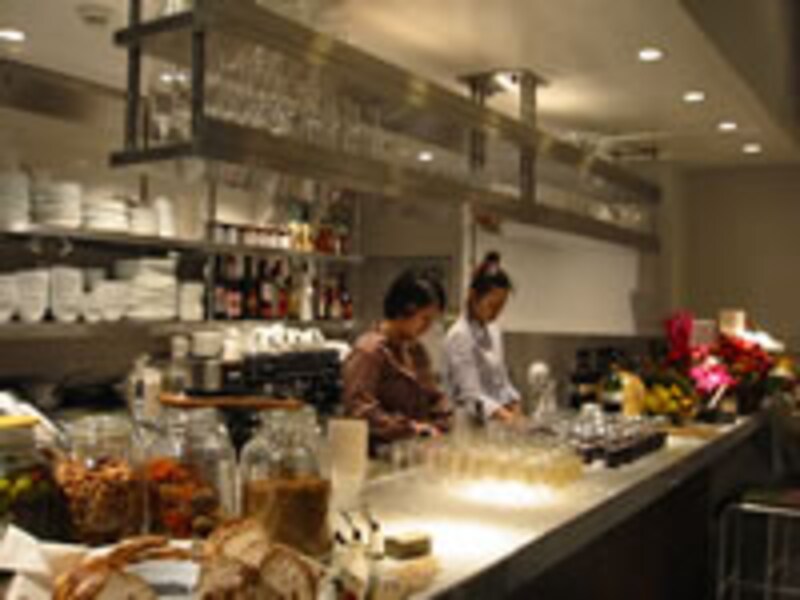ステンレスと大理石そして無垢板の素材という、オーガニックでナチュラルなミックスマテリアルで構成されたオリジナルキッチン。連休の昼食どきに再度取材に伺ったバーカウンターで、調理したてのカルボナーラを食されるIDEE社長の黒崎氏。 快く取材に応じてIDEEの理念を語っていただいた。 |