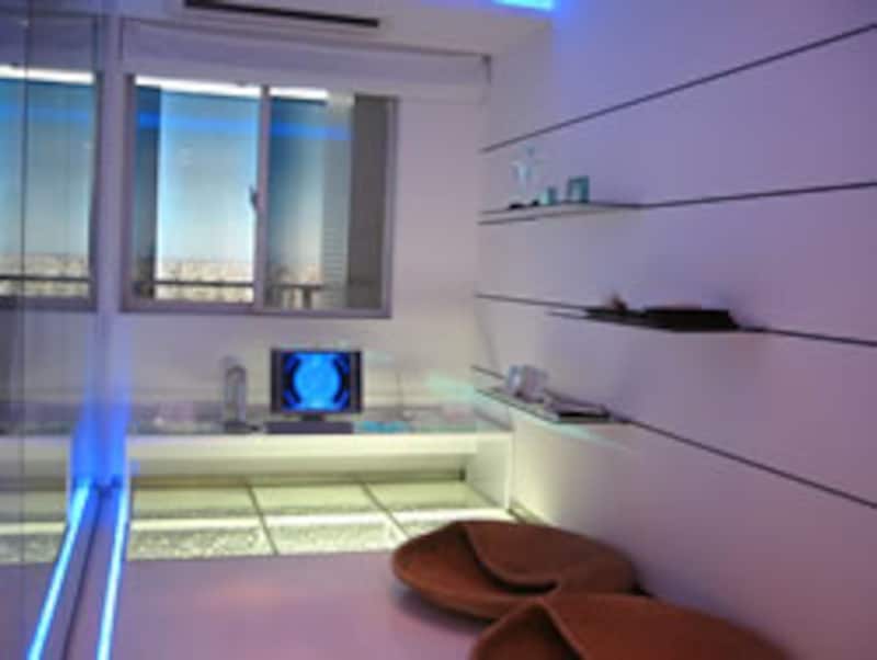 | 玄関を入ると正面にDENと呼ばれる約5帖の書斎空間。 ITマンションにふさわしく光ケーブルが基本装備(住戸内へはメタル配線)されている。左のリビングとの境のガラスパーティションには液晶プロジェクターから大型の映像が投影される。 床・壁・天井の白と幻想的なブルーライトの照明がこのインテリアを際立たせる。 ソニーと、鹿島建設とのコラボレーションによる、光と音と映像の空間は、豊かな感性を持つ人にとって、かけがえのない生活空間となるだろう。 |