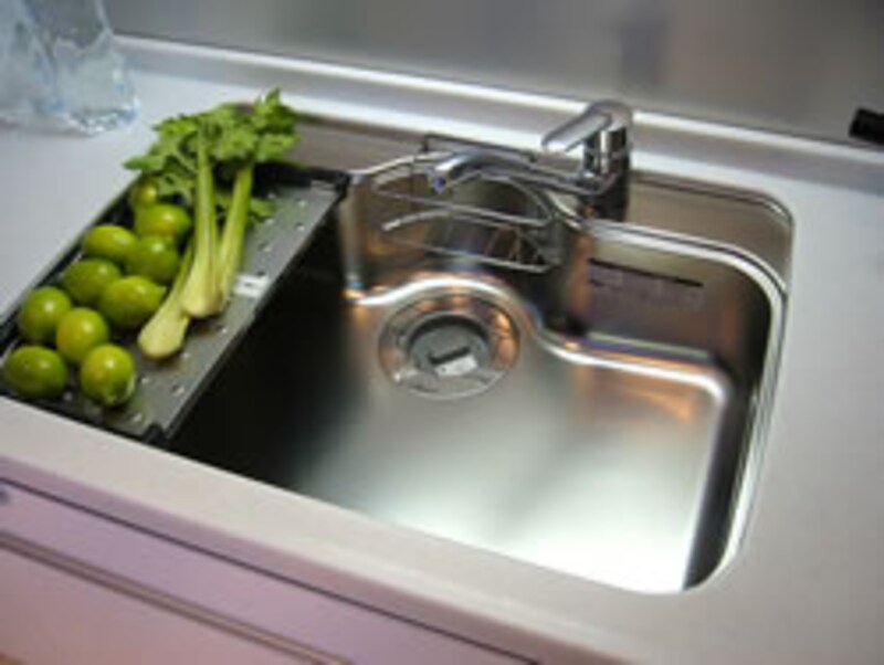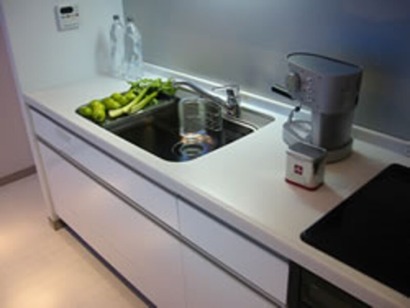 | 750巾のステンレスシンクと、シングルレバー混合水栓(アメリカンスタンダード製)。 給湯はバルコニー設置の24号ガス給湯器を利用。温水循環式の床暖房システムも各住戸のリビングダイニングスペースに採用されている。 |