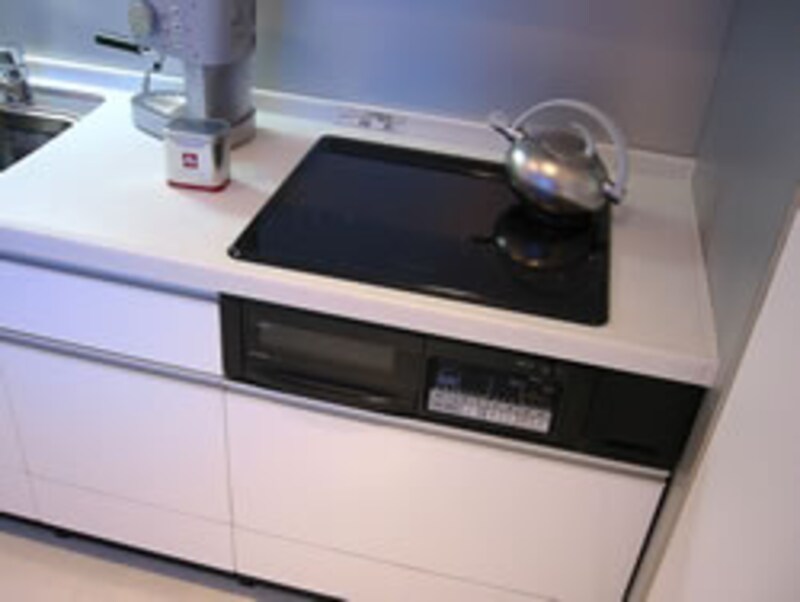 | キッチンは電化で、2口のIHクッキングヒータ-と一口のラジェントヒーター、魚焼きグリルが組込まれている3口クックトップ。 IHは調理鍋を選ぶが、ラジェントヒーターが一口あるので、手持ちのアルミや銅の鍋も使える。この下に組込み可能なオーブンレンジはオプション仕様。 |