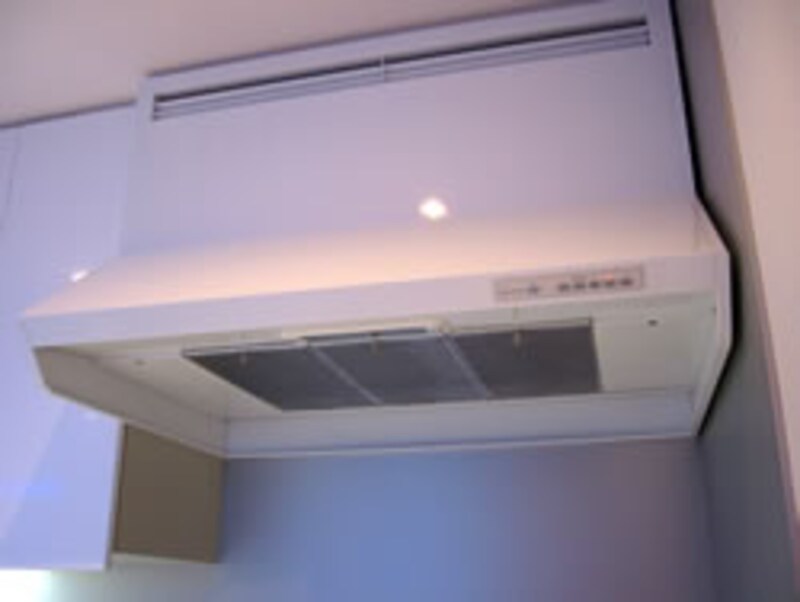 | 同時給排気タイプのレンジフード。 キッチンのバックパネルはアルミの不燃化粧板を利用して、白とメタルカラーに徹底してこだわったカラーコディネーションとなっている。 |