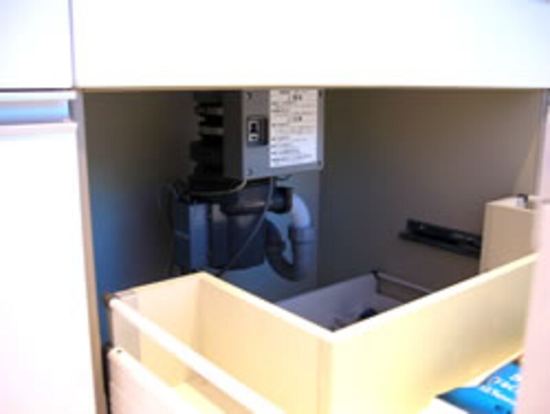 | シンク排水口に設置された、生ゴミ処理のためのディスポーザー。 この集合住宅全体の生ゴミは、共用部に設置された排水処理装置で汚水処理をしてから下水放流する生ゴミ処理システムを採用している。 |