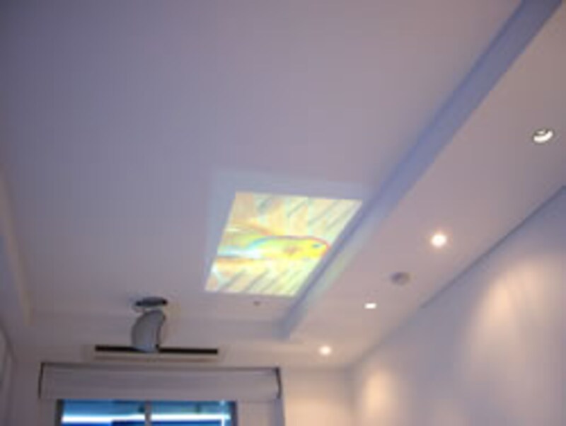| ベッドに寝転がって見る天井投影のプロジェクター映像。 拡大投影すると、天井一杯に映像が拡がり、従来の映像とは違った不思議な体験ができる。 |