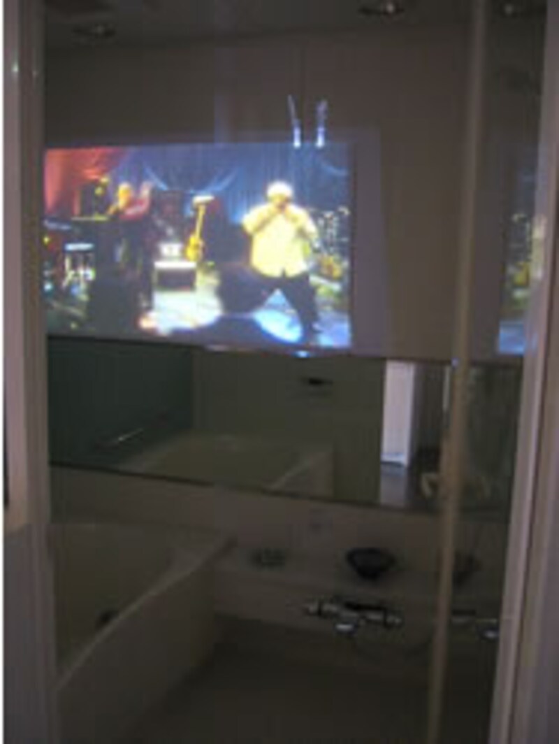 | このバスルームの壁面にも、ドラム式洗濯乾燥機上部に組込まれたプロジェクターから映像が投影され、入浴したまま映像を楽しむことができる。 この住戸モデルだけでも、合計4台の液晶プロジェクターが組込まれ、各部屋で様々な映像を楽しむことができる。 |