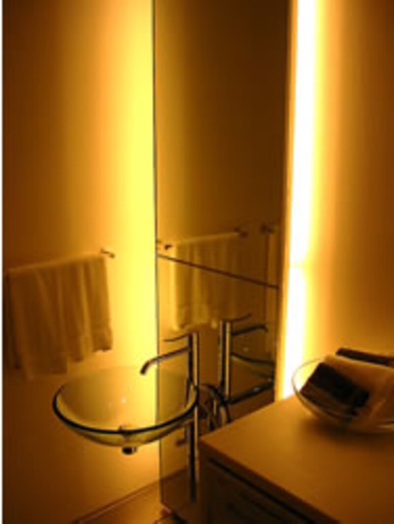 | ちょっとオシャレでスタイリシュな洗面ボウルと、間接照明の仕込まれたミラーパネル。 |