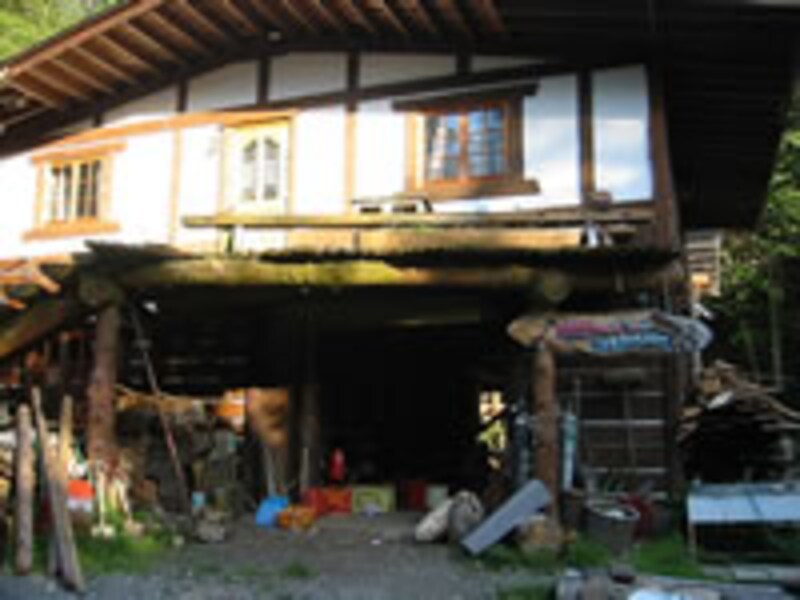 | ワークショップと名付けられた工房の建物。 一見直角の建物にも見えるが、なかなかどうして水平垂直の部材は殆どない。 二階は、イソーローと呼ぶ仲間たちの住居スペースだそう。 |