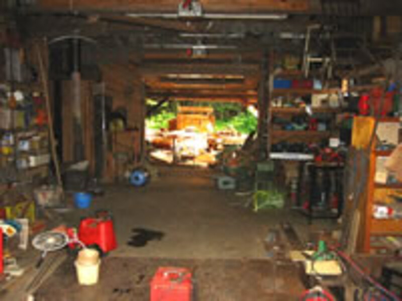 | ワークショップの内部。 奥には、家具や建具をこれから作るという材料が山積みになっている。 |