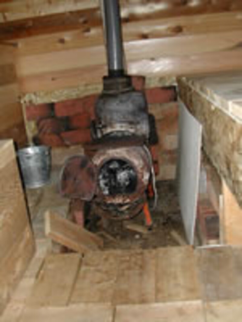これは、プロパンのガスボンベを三つ溶接して作ったというサウナ風呂の蒸気発生窯。 男の隠れ家として、このサウナは絶大な人気があるという。 |
