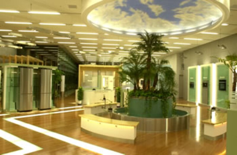 | この新ショールームの基本コンセプトは、「人と環境にやさしい」ショールーム。 水、緑、マイナスイオンなどをキーワードとして、ショールーム全体を構成している。 |