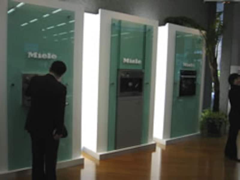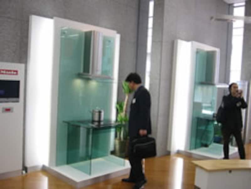 | ガラスを使った軽快なディスプレイシステムは、機器の納まり具合を確認するにも理解しやすい。Mieleには電磁調理器やガスのクックトップもあるが、国産に比較するとコスト高となり、当面の輸入販売は計画していないとのこと。 |