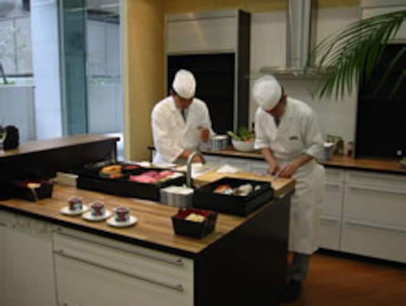 | シンプルな構成のこちらのキッチンは、壁面側にクックトップと家電収納ユニット。カップボードを組み合わせた変型アイランドにシンクを配置している。 HOTEL HYATTの板前さんも、その使い勝手の良さにはひとしきり感心!! |