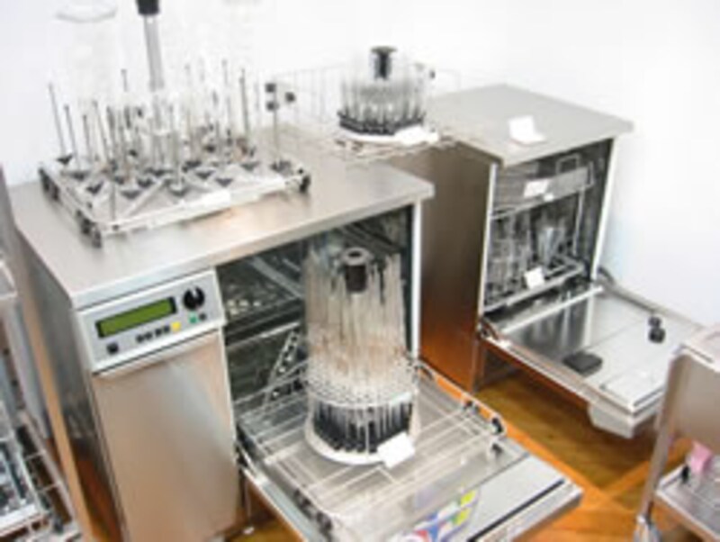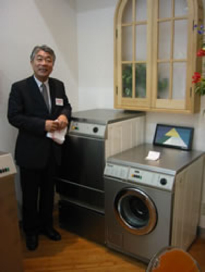 | プロフェッショナルルームに立つ、旧友のF氏。 その昔、某輸入システムキッチンのトップセールスマンとして名をなした彼は、現在Mieleの業務用洗濯機や乾燥機など特殊機器の販売を担当している。 エステサロンや理美容院向けの、95度もの高温で洗濯乾燥する特殊な洗濯機や乾燥機、病院や実験室の道具を殺菌洗浄する、特種洗滌機など、非常にユニークな商品も見ることができる。 |