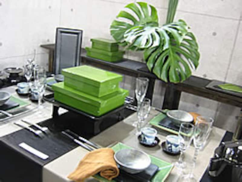 | フレッシュグリーンのお重と皿が、黒のダイニングセットとさらし色のクロスにアクセントをつけ、胸がときめく魅力の色の組み合わせとなっている。 |