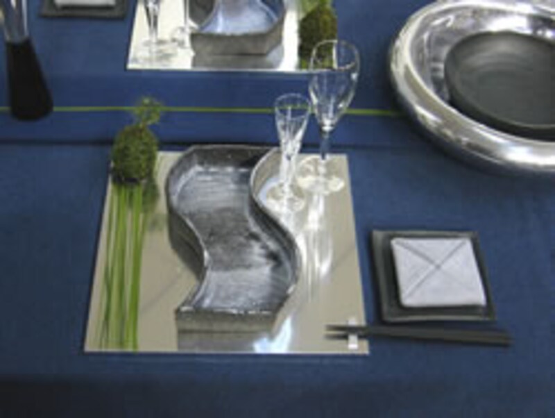 | 壁面の、苔を植えたパネルがまず目を引く。ブルーのクロスと黒の皮張り椅子以外はやはりモノトーンの世界。 流れるような銘々皿のデザインもユニーク。静かな空間に波の動きを感じさせてくれる。 |